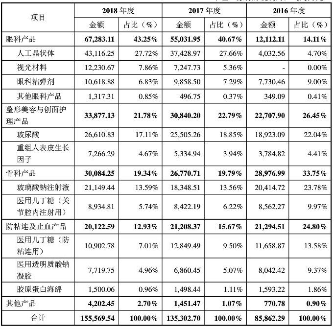 具体到业务板块的收入结构看,眼科、医美、骨科、外科四个板块的收入分别为6.7亿元、3.4亿元、3亿元、2亿元,其中,眼科领域的人工晶状体的的增长不容小觑。2016年,人工晶状体的收入仅为4032万元,到2018年收入增长10倍,达到了4.3亿元,主营业务的占比由4.7%迅速提升到27.7%。