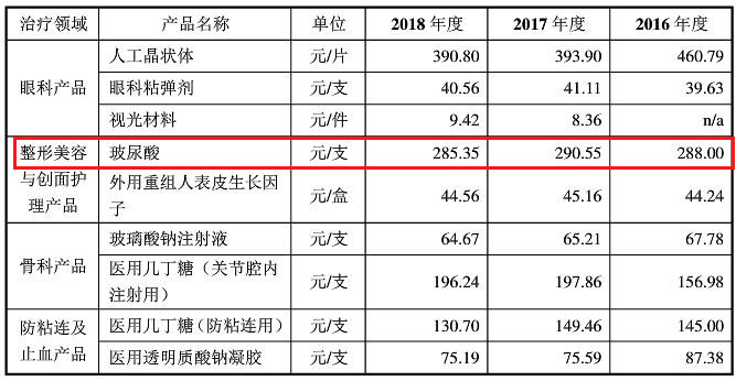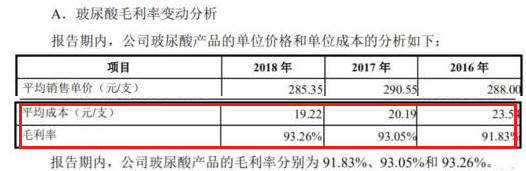 其中,医用透明质酸其实就是大众俗称的玻尿酸,招股书显示,昊海生物2018年一年生产103万支玻屑酸、卖了93万支,一支成本不到20元,销售价285.35元,毛利率高达93%。