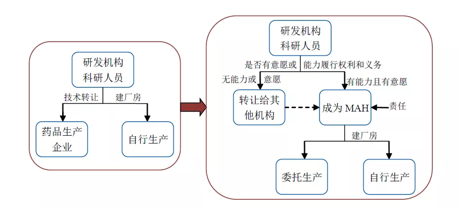 MAH之前我国新药药品技术转让只允许在从(非) 生产主体到生产主体,MAH之后,药品转让与受让的主体均不受限制,可以从(非) 生产主体到(非)生产主体,但产地或生产商必须达到GMP 的要求。这意味着技术引进无需再花大量资本投入重资产,整合现有的生产资源,就可以地产化了。非生产主体的投入将有望获得原来只有生产主体才能获得的回报。药品上市许可持有人制度实施推动了越来越多的研发机构采取License in/IP+CRO+VC的模式引进产品。