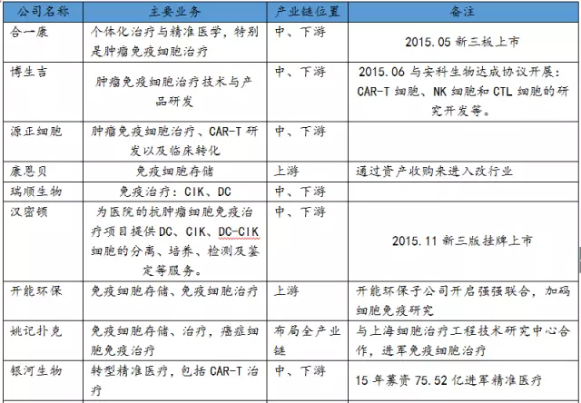 国内这几年的免疫细胞治疗发展迅猛,但是技术相对还不成熟,主要产业链为上游的细胞存储以及中游较为粗犷的细胞免疫疗法,包括免疫细胞移植的抗癌、保健以及美容业。