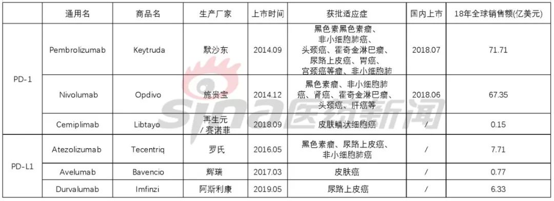 肿瘤免疫治疗并不直接攻击癌细胞,而是通过激活人体自身免疫系统来抗击肿瘤,具有良好的安全性及耐受性,目前全球上市6个PD-1/PD-L1药物,分别为BMS的Opdivo(2014)、Merck的Keytruda(2014)、罗氏的 Tecentriq(2016)、阿斯利康的Imfinzi(2017)、辉瑞的 Bavencio(2017)以及赛诺菲/再生元的Libtayo(2018),概况见表1