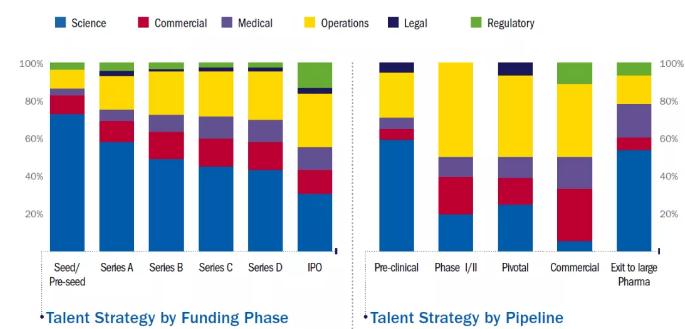 细胞和基因疗法公司人才构架随公司发展(左图)和管线研发进度(右图)而发生的变化(图片来源:参考资料[1])