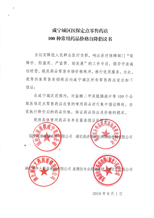 该倡议由咸宁市医疗保障局鼓励湖北高济明联医药商场连锁有限公司、麦德信专业药房连锁(湖北)有限公司、湖北康华大药房连锁有限公司、国控药房连锁咸宁公司四家大型零售连锁药店联合发起。
