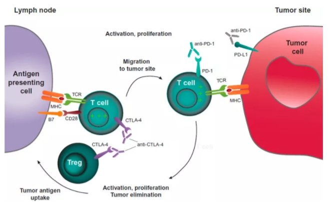 此外,CTLA-4抗体主要作用于T细胞发育的早期,与起始T细胞表面上的CTLA-4结合后,可解除抗原呈递细胞对T细胞的抑制,间接促进T细胞的活化和增殖。不仅如此,CTLA-4抗体还可解除抑制调节T细胞对T细胞活化和增殖的抑制作用。也就是说,CTLA-4抗体,可以从源头上增加外周循环中的活化T细胞,通过这些方式增强免疫系统的抗癌能力。
