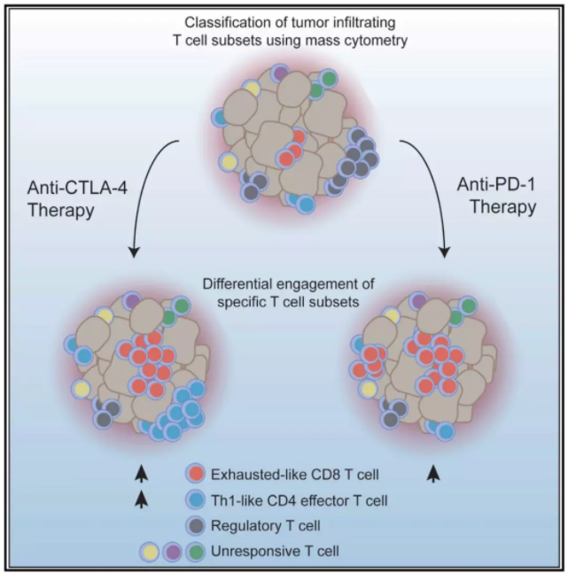 除了上述 “空间”和“时间”上的不同机制以外,PD-1抗体和CTLA-4抗体还针对肿瘤浸润T细胞中的不同亚型。其中,PD-1抗体主要影响肿瘤浸润耗竭样CD8+ T细胞,而CTLA-4抗体除此之外还能引导ICOS+ Th1型CD4 T细胞的扩增——2017年James Allison带领团队进一步证实了抗CTLA-4和抗PD-1疗法两者不同的作用机制,为这两者联合使用再添有力证据,该项研究成果发表于当年的《细胞》杂志上[9]。