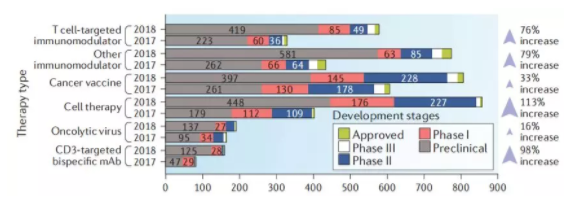 自2017年Novartis和Kite的两款CD19-CART(Kymriah和Yescarta)批准上市以来,细胞治疗也刮起了一股炫风。相比2017年,2018年细胞治疗activeagents增加了113%,是各种肿瘤免疫治疗方式中增加比例最大的,由此也能看出各大药企对新型免疫治疗的痴迷和追求,争取在新的领域率先开辟自己的一片天地。