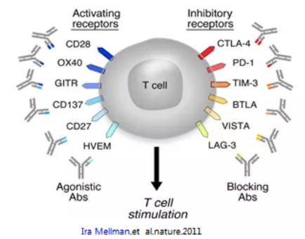 除了PD1/PD-L1这条肿瘤免疫逃逸通路的抗体外,T细胞上其他的可能参与逃逸的免疫共抑制性受体和免疫共刺激性受体的大分子agents也紧锣密鼓地在各个临床试验阶段进行,包括封闭、激活两个不同受体的双抗。