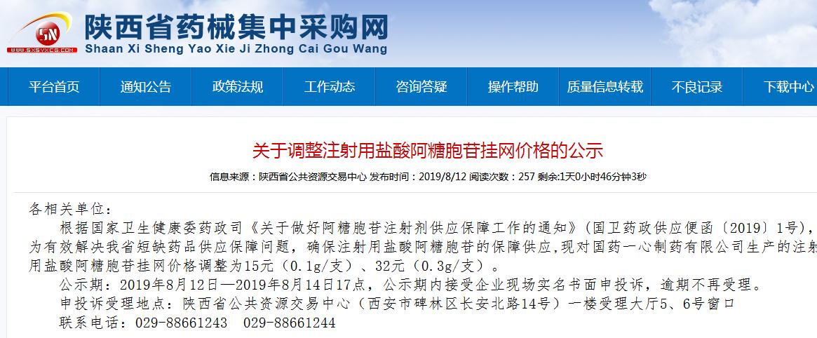 近日,陕西省药械集中采购网发布《关于调整注射用盐酸阿糖胞苷挂网价格的公示》称,为有效解决我省短缺药品供应保障问题,确保注射用盐酸阿糖胞苷的保障供应,现对国药一心制药有限公司生产的注射用盐酸阿糖胞苷挂网价格调整为15元(0.1g/支)、32元(0.3g/支)。