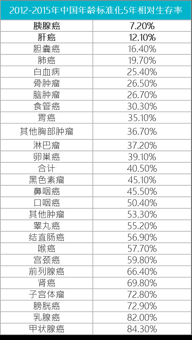 在生存率方面,从国家癌症中心学者对其中 17 个癌症登记处的分析中可以看出,2012-2015 年,中国癌症的五年生存率整体约为 40.5%,比 2003-2005 年的五年生存率 30.9% 上升了将近 10 个百分点;而肝癌的五年生存率排行倒数第二仅次于癌中之王胰腺癌,从十年前的 10.1% 上升 2 个百分点到 12.1%。