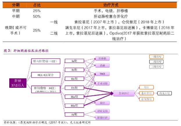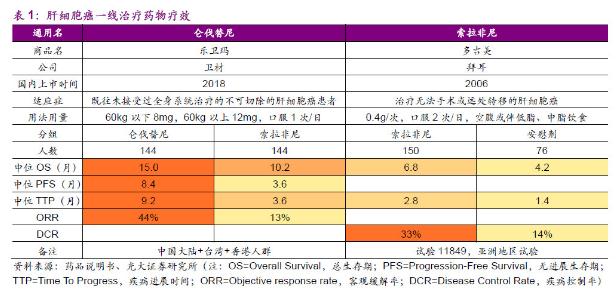目前,晚期肝癌(HCC)的靶向一线治疗药物包括 2007 年上市的索拉非尼和 2018 年上市的仑伐替尼。2007 年上市的索拉非尼在临床用了 10 年,直到 2017 年才有第二个针对肝癌的靶向药物仑伐替尼才上市,有效药物的缺乏造成了肝癌不容乐观的生存率。