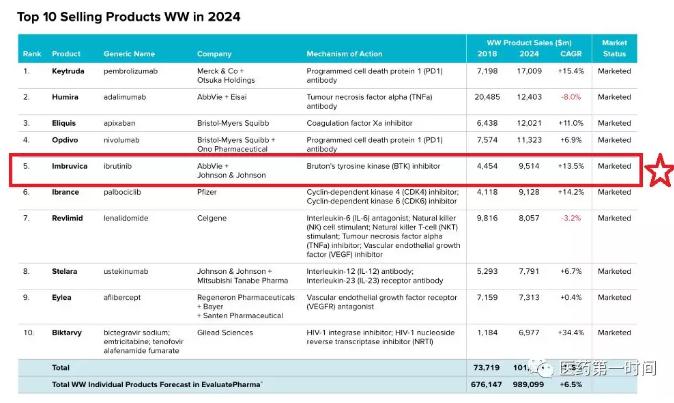 自上市以来,Imbruvica全球销售额呈直线上升。业界对Imbruvica的商业前景非常看好,根据EvaluatePharma今年6月发布的报告,Imbruvica在2018年的全球销售额达到了44.54亿美元,随着市场的不断渗透及适应症的不断增加,该药在2024年的销售额将达到95.14亿美元,成为仅次于Keytruda、Opdivo之后的全球第三大畅销肿瘤药。