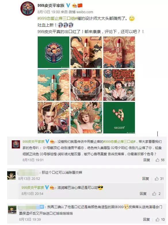 近日,999皮炎平家族官方微博发布了一则重磅消息:继马应龙之后,999皮炎平也进入了时尚界的争夺战。止痒三口组口红闪瞎氪金狗眼,“鹤顶红”、“夕阳红”和“够坦橙”霸气侧漏。继“一种药的两种用法”后网友评论:“治疗唇炎的最好用药,嘴痒必备”。周末两日“皮炎平口红”连登微博热搜榜,截止成稿,热门微博话题已转发1.9W次,1万讨论。