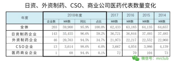 如果把 2018 年度的医药代表分成日资系、外资系、CSO、商业公司来看,日资药企(如武田、安斯泰来、第一三共等)共有 35455 名医药代表,比上一年减少1266人,外资药企(如辉瑞、阿斯利康、默沙东等)共有医药代表 20763 人,比上一年减少了 1210 人,CSO 公司共 3614 名医药代表,比上一年减少 53 人。