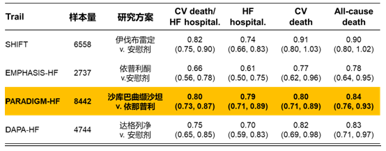 沙库巴曲缬沙坦的III期临床研究--PARADIGM-HF研究,结果显示,对比传统心衰药物治疗的金标准ACEi(依那普利),沙库巴曲缬沙坦能进一步显著降低HFrEF患者主要终点(心血管死亡或心衰住院)风险20%( p=0.0000004),心血管死亡风险20%、首次因心衰住院风险21%、全因死亡风险16%。
