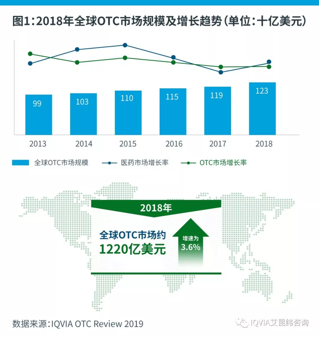 IQVIA全球非处方药市场报告显示,2018年,全球OTC市场回暖,占到整体医药市场10.6%的份额,规模约为1220亿美元,增速较2017年上涨0.2个百分点,为3.6%。2016-2018年的3年复合增长率稳定在4.1%左右。