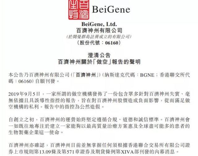 2019年9月5日,一家所谓的做空机构发布了一份包含众多针对百济神州失实、毫无依据且具误导性指控的报告,旨在对百济神州股价造成负面影响,从而满足做空机构的私利。报告中的指控为公然造假。