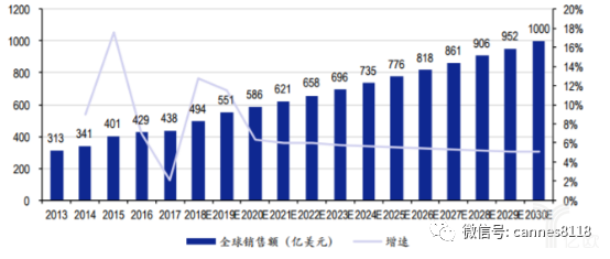 下图:2013-2030年全球疫苗行业市场规模变化趋势及预测