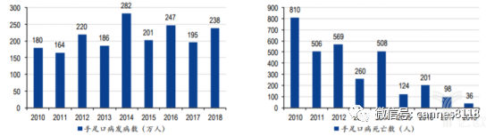 下图:2010-2018年我国手足口病报告发病人数及2010-2018年我国手足口病报告死亡人数