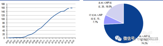 下图:2000-2018年全球将PCV纳入NIP的国家数量及2018年全球PCV的NIP纳入情况分析