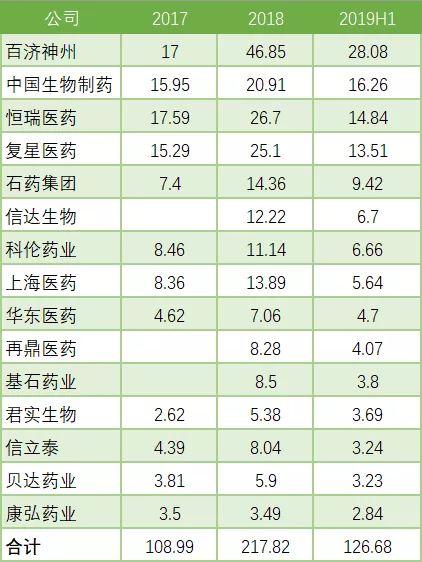 随着各大药企2019H1财报的发布,各家的研发投入、销售业绩等也随之披露。笔者挑选了研发投入在国内居于前列的15家企业进行了统计,发现这15家公司在2019上半年的研发投入合计为126.68亿元,在经历了2018年行业研发投入翻番的情况下同比仍有较高两位数的增长。总体来看,中国制药企业的研发投入仍在持续增加。