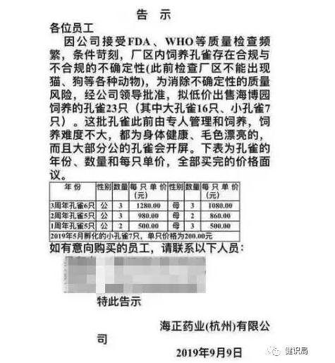海正药业(杭州)表示,因公司接受FDA、WHO等质量检查频繁,条件苛刻,厂区内饲养孔雀存在合规与不合规的不确定性,为消除不确定性的质量风险,遂将海博园饲养的23只孔雀出售。据悉,此前检查厂区不能出现猫、狗等各种动物。