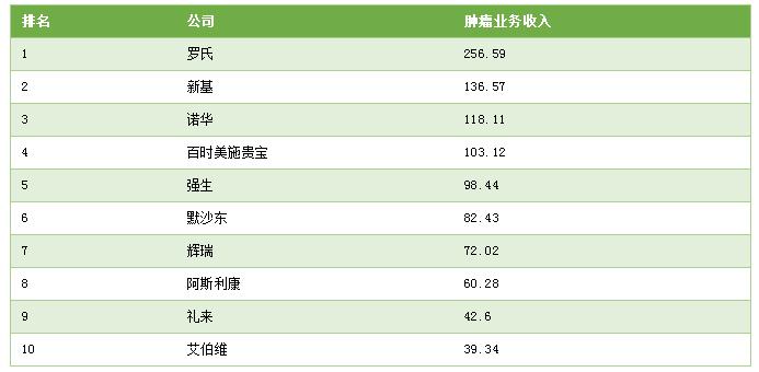 按照 2018 年度肿瘤业务收入,这家调研公司排出了全球 10 大肿瘤药公司(单位:亿美元):