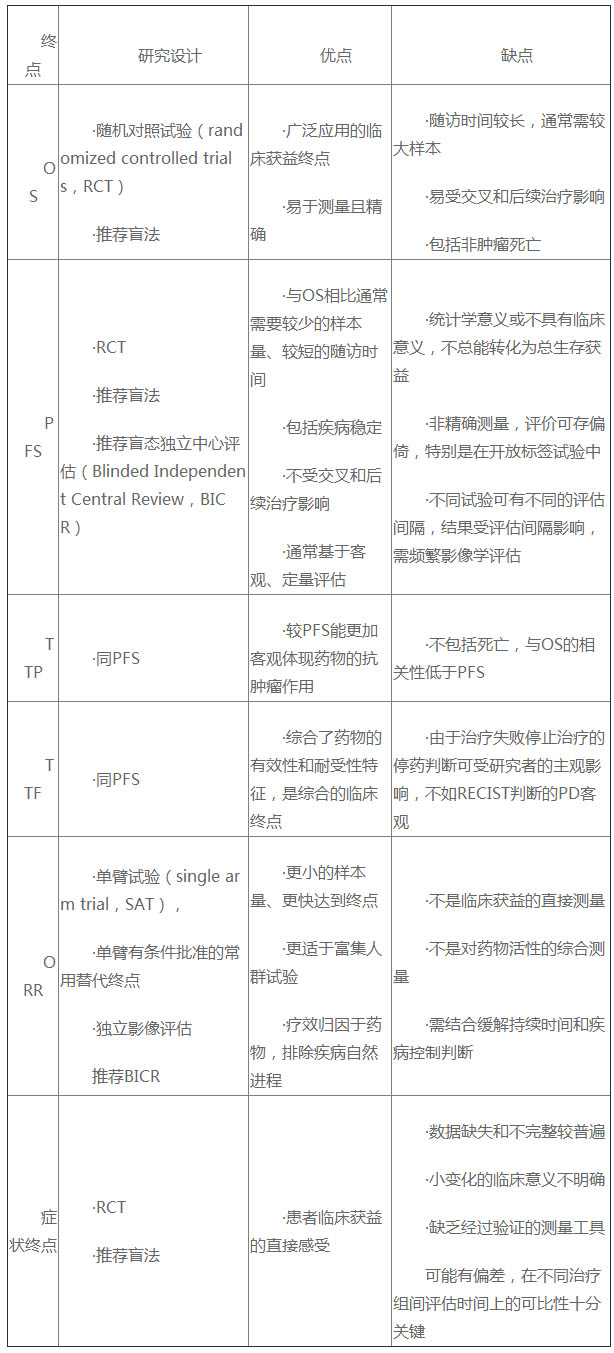 终点的选择应结合肿瘤分期、既往治疗和起效特点等因素综合考量。