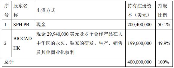 其中,SPH PB以现金出资2.004亿美元(折合人民币14.21亿),占合资公司50.1%股权;BIOCAD HK以现金0.299亿美元(折合人民币2.06亿)及6个合作产品在中国大陆、香港特别行政区、澳门特别行政区和台湾(以下简称“合作区域”或“大中华区”)的永久、独家的研发、生产、销售及其他商业化权利,共计出资2亿美元(折合人民币14亿),占合资公司49.9%股权。