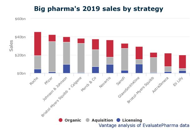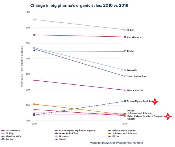 就2019年销售额而言,强生和辉瑞位列前三大制药公司行列,因此deal-heavy策略并未对他们造成伤害。BMS在完成对新基的收购后。