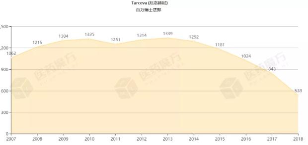 厄洛替尼自上市以来,销售额不断增长,2013年达到13.39亿瑞士法郎的销售峰值。此后受专利到期影响销售额逐渐下滑。