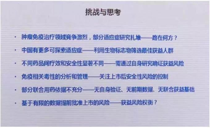 聪明的策略没有问题,问题是大家都这样思考做决定,拥挤就是今天的必然结果,平均智商120以上的投资者看不见吗?当然不是,而是没有退路,骑虎难下,只能硬着头皮上,寄希望于“我比别人快”和“万一对方不小心失手了呢”的对赌心态,毕竟要给投资者一个故事一点希望。现在看来,弯道超车是不大可能了,没有弯道翻车已是万幸。2款进口和3款国产PD-1抑制剂上市后,临床可及的问题得到缓解,平抑PD-1抑制剂市场价格的“副作用”初步体现。之后,没有亮眼的有效性,比如CDE所指的HR小于0.45,靠单臂临床研究获批适应症,可能性极低。更多的方向在PD-1/PD-L1抑制剂的联合,与已经批准产品的适应症扩展。CDE给出了几个方向。