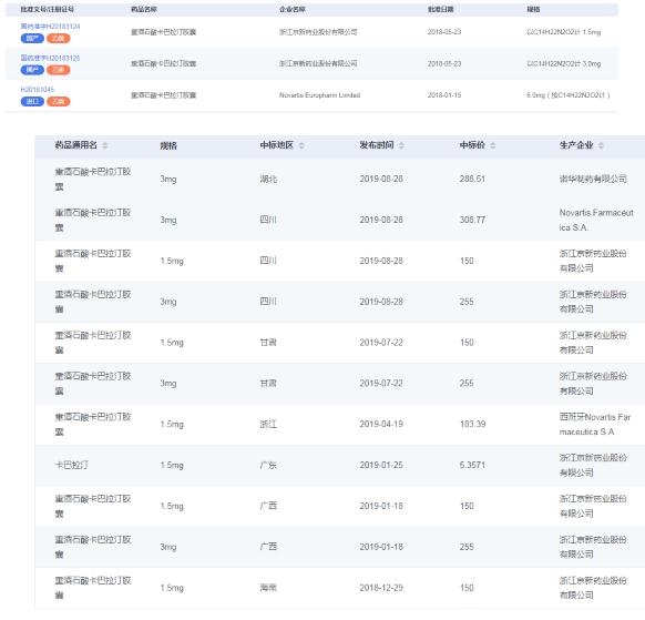卡巴拉汀目前有两家生产企业,分别是诺华制药与浙江京华,市场销售均较好。从2019年1-9月中标数据可得知,浙江京华最低价格为15元,相当于诺华的1/2,具有较大的价格优势,恰值国家大幅度削减药品单价,销售额度或许会有所上升。