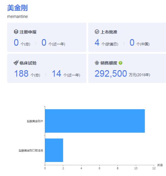 目前来说,美金刚2018年销售额度初步统计大约为29亿元,近一年里,关于美金刚的临床试验也有14个之多。生产企业剂型为:原料药3家、片剂2家、口服溶液2家(具体情况见药智数据库)。2019年1-9月中标数据库显示可知,盐酸美金刚片最为畅销。