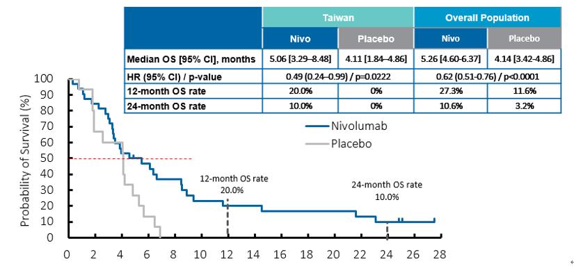 纳武利尤单抗组与安慰剂组中位生存期分别为5.06个月和4.11个月;