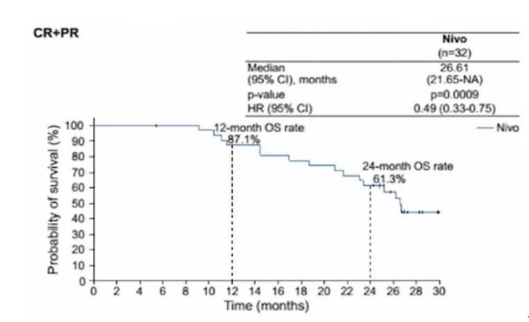 与安慰剂组相比,纳武利尤单抗组死亡风险下降51%(HR=0.49,95%CI (0.24-0.99),p=0.0222 );