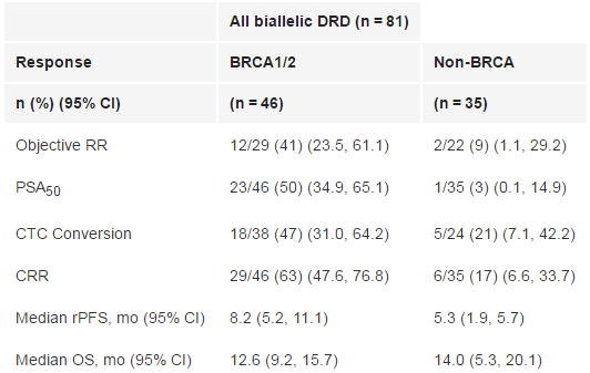 该研究的数据已于9月底在2019年欧洲肿瘤医学学会(ESMO)年会上公布。截止2019年5月23日,共入组了165例mCRPC患者,其中81例携带双等位DRD(46例BRCA和35例非BRCA),在数据截止时对这些患者进行了至少16周的随访。81例患者中有51例在基线疾病可测量(29例BRCA,22例非BRCA),对BRCA和非BRCA患者的中位随访时间分别为7.3个月和6.4个月。