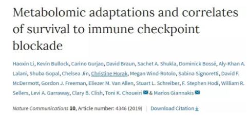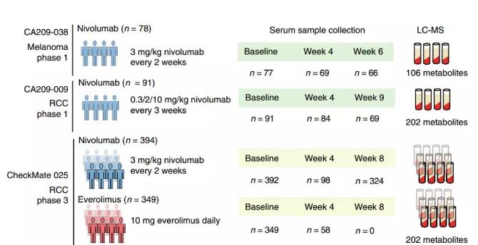 在这项研究中,科学家们分析了3个独立免疫治疗试验患者(包括黑色素瘤患者和肾细胞癌患者,都接受Nivolumab治疗)的血液样本,并分别在治疗开始前和治疗期间的几个时间点测量了参与氨基酸、核苷酸、氮和脂质等代谢的代谢物变化。