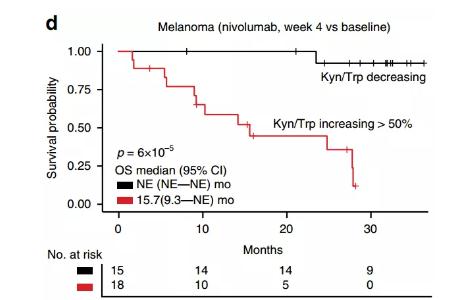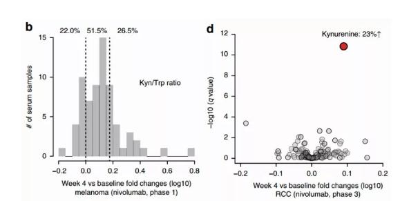 他们发现在黑色素瘤组中,78%患者的Trp向Kyn转化率在治疗第4周时增加,其中转化率增加超过50%的患者达26.5%(下图b)。在肾细胞癌患者中,Nivolumab治疗也与Kyn的增加有关(下图d)。
