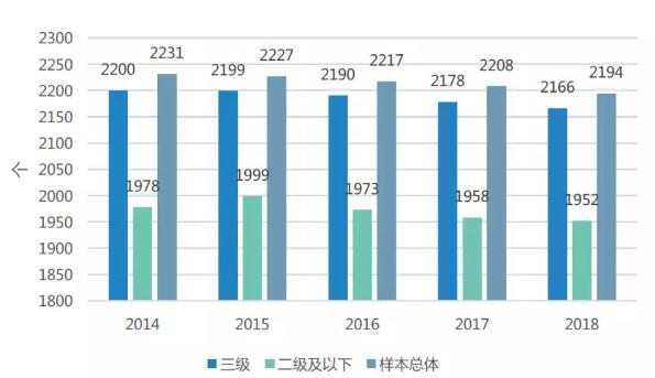 在全药使用品种数上,从《报告》给出的近五年数据来看,整体来说,医院对药品使用品种数的需求基本稳定。但值得注意的是,不同级别的医院都呈现小幅减少的趋势,样本医院总品种数从2014年的2231种减少到2018年的2194种,退出182 个品种,新增145 个品种,净减少37个品种。