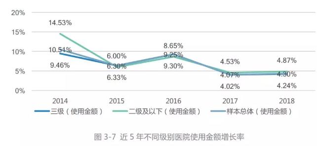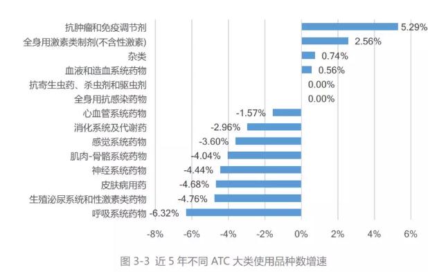在医保控费、合理用药等政策组合拳的施行下,各级医疗机构近五年全药使用金额增速明显放缓,其年增速已经从2014年的10.51%下降到2018年的4.30%,但在不同ATC大类中,使用金额的变化幅度并不大,均是小于2%。