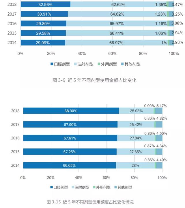 值得注意的是,在2018年全药不同剂型使用情况的统计发现,在使用金额和使用频度上,注射剂型和口服剂型呈现截然相反的两种趋势。《报告》指出,注射剂型使用金额最多,占全药整体使用金额的62.62%;而在使用频度上,口服剂型最高,占到全药整体使用频度的68.90%。