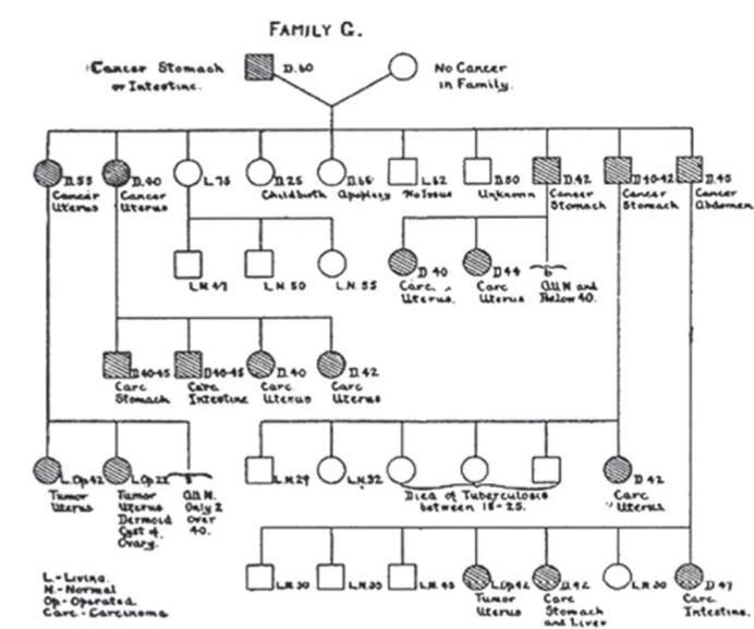 1895年,美国病理学家吴爱哲(Aldred Scott Warthin)发现他家的一位女裁缝闷闷不乐,便问其原因。这位女裁缝倾诉道,她家族几代人中有很多都死于癌症,所以她担心自己也难逃此劫。不出所料,女裁缝最后也死于了癌症。眼前这一幕悲剧让吴爱哲感到痛惜和震惊,同时受过专业训练的他产生了一种直觉——这很可能是一种遗传性疾病。经过多年研究后,吴爱哲于1913年发表了他的研究成果:在女裁缝家族中,癌症患者的后代也多患有癌症;非癌症患者的后代则无一人得癌。