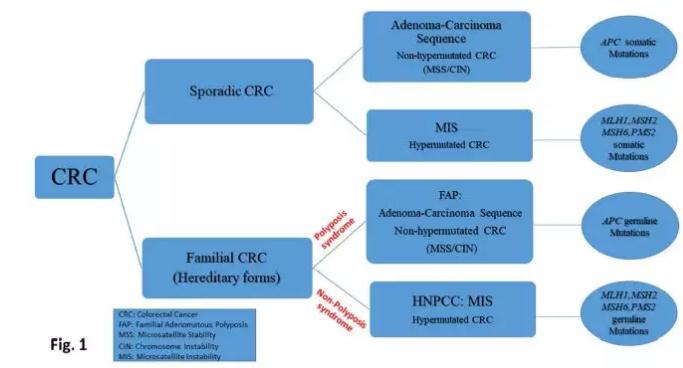 1987年,英国牛津大学沃尔特·博德默(Walter Bodmer)教授发现遗传性结直肠癌“家族性腺瘤性息肉病”(Familial Adenomatous Polyposis, FAP)的形成和5号染色体上一种名为APC(adenomatous polyposis coli)的基因突变有关;六年后,其它科学家发现“林奇综合征”与2号染色体上存在的微卫星(细胞基因组中重复、简单的DNA序列)不稳定(MSI)现象有关。这两个重大发现不仅揭开了困扰这些家族几代人的迷雾,也使科学家第一次从分子水平上来了解这种疾病。