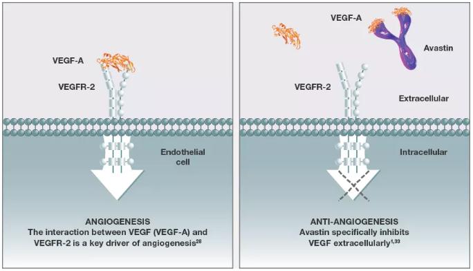 Avastin的作用机制与Erbitux不同。研究发现,肿瘤细胞通过建立自身的血管网络来获取增长、繁殖所需的“营养”,而血管内皮生长因子(VEGF)是肿瘤血管生长中所必需的一种蛋白质。因此,Avastin通过与VEGF结合,防止它们与VEGF受体(VEGFR)结合,切断肿瘤的“输养渠道”来抑制其生长和转移。值得一提的是,Avastin也是癌症治疗史上首个“通过抑制血管生长来遏止肿瘤增生”的靶向药。