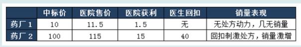 可见,取消药品加成没有改变本就虚高的药品中标价以及虚高价格下暗藏的巨大的回扣空间,依然通过采购、处方高价有回扣的药品获得地下收益,依然是采购价格越高则地下收益越大。对于药厂来说,低价中标意味着“死标”,没有回扣空间,不可能激发销量;反之,若高价中标,回扣空间大,处方便随之暴涨。