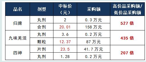 例如,中标价20.01元的归脾合剂,采购额158万元,而中标价为2元的归脾丸同期采购额仅0.3万元,高价中标品采购额是低价中标品的527倍。