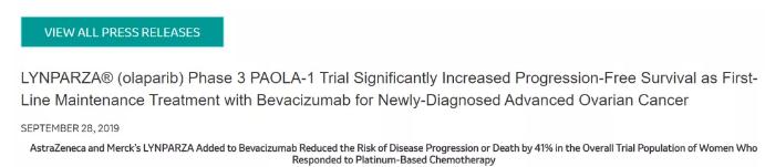 不过值得一提的是,在阿斯利康和默沙东于ESCO上公布的“olaparib联合bevacizumab治疗新确诊的、响应含铂化疗的晚期卵巢癌患者”的III期试验PAOLO-1的结果中,同源重组正常的患者在接受治疗后,与安慰剂组相比,无进展生存期无统计学差异。