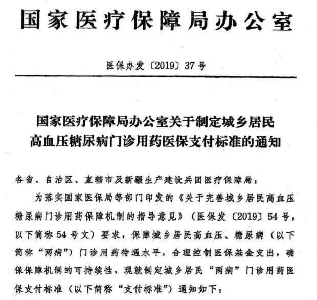 近日,一份由国家医保局印发的《关于完善城乡居民高血压糖尿病门诊用药医保支付标准的通知》(以下简称通知)在业内流传,该文件是为落实《关于完善城乡居民高血压糖尿病门诊用药保障机制的指导意见》(以下简称《指导意见》)要求,就城乡居民“两病”(高血压和糖尿病)门诊用药医保支付标准而制定的最新配套文件。