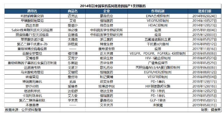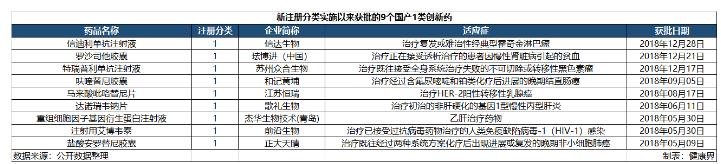 近年来,创新药已经成为我国医药行业的关键词,涌现了一批创新药企业。2018年药审中心批准了9个国产1类创新药,创历史新高。近年来批准的国产创新药中不乏代表性产品,如紧随世界步伐的三款国产PD-1单抗,中国首发全球新药罗沙司他,中国自主研发的First in Class药物本维莫德等,这些都是国内创新药企业不懈努力的关键成果。