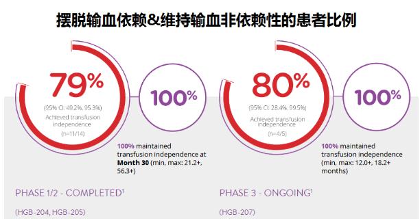 在这些临床试验中,高达75%-80%的患者摆脱了对输血的依赖。数据截止时,所有已摆脱输血依赖的患者均维持输血非依赖性,已有患者近6年(56个月)没有接受输血。